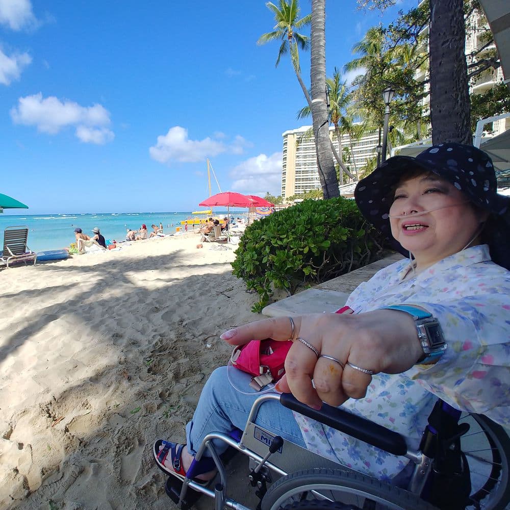作業療法士として世界を行き来していたので海外旅行が大好き。在宅療養中も携帯酸素濃縮器を海外から取り寄せて旅をされていました。とりわけハワイが大好きで、最後まで「また行きたい!」とおっしゃられていた地です。椎名先生は、基本カメラを向けても笑顔ではありません。でも、ハワイでは自然と笑顔がこぼれている写真が多いです。